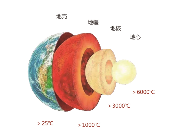 自然課本中曾經講過,地球內部分為三個同心球層:地殼、地幔、地核(含內核和外核),三者的深度范圍大致為:30千米~ 70千米、2900千米、6378千米,溫度如圖所示。由于地下復雜的地質結構和構造運動,導致地球表面的熱流量分布不均,這才形成了地熱異常。
