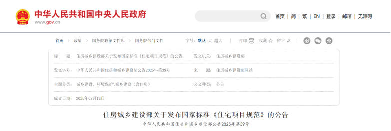 近日,住房城鄉建設部批準《住宅項目規范》為國家標準,編號為GB 55038-2025,自2025年5月1日起實施。住房城鄉建設部發布的公告明確,本規范為強制性工程建設規范,全部條文必須嚴格執行。現行工程建設標準中有關規定與本規范不一致的,以本規范的規定為準。新規范以住宅項目整體為對象,以安全、舒適、綠色、智慧為目標,在規模、布局、功能、性能和關鍵技術措施等方面,對住宅項目的建設、使用和
